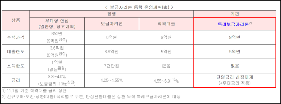 정부는 국민들의 금리부담 경감을 위해 23년 한시적(1)으로 일반형 안심전환대출과 적격대출을 보금자리론에 통합하여 특례보금자리론으로 운영할 계획입니다.