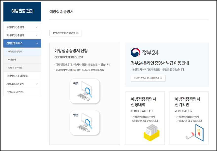 전자민원서비스 → 예방접종 증명서를 클릭. 예방접종증명서 신청에서 국문 혹은 영문을 클릭합니다.