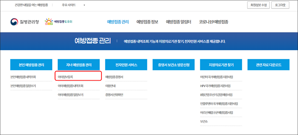 예방접종 관리 → 자녀 예방접종 관리 → 아이정보등록 메뉴를 선택하시어 아이의 정보를 먼저 등록하여줍니다.