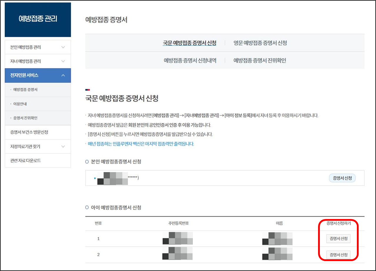 하단에 보면 등록한 자녀가 나오며 증명서신청을 클릭하면 예방접종 증명서를 출력할 수 있습니다.